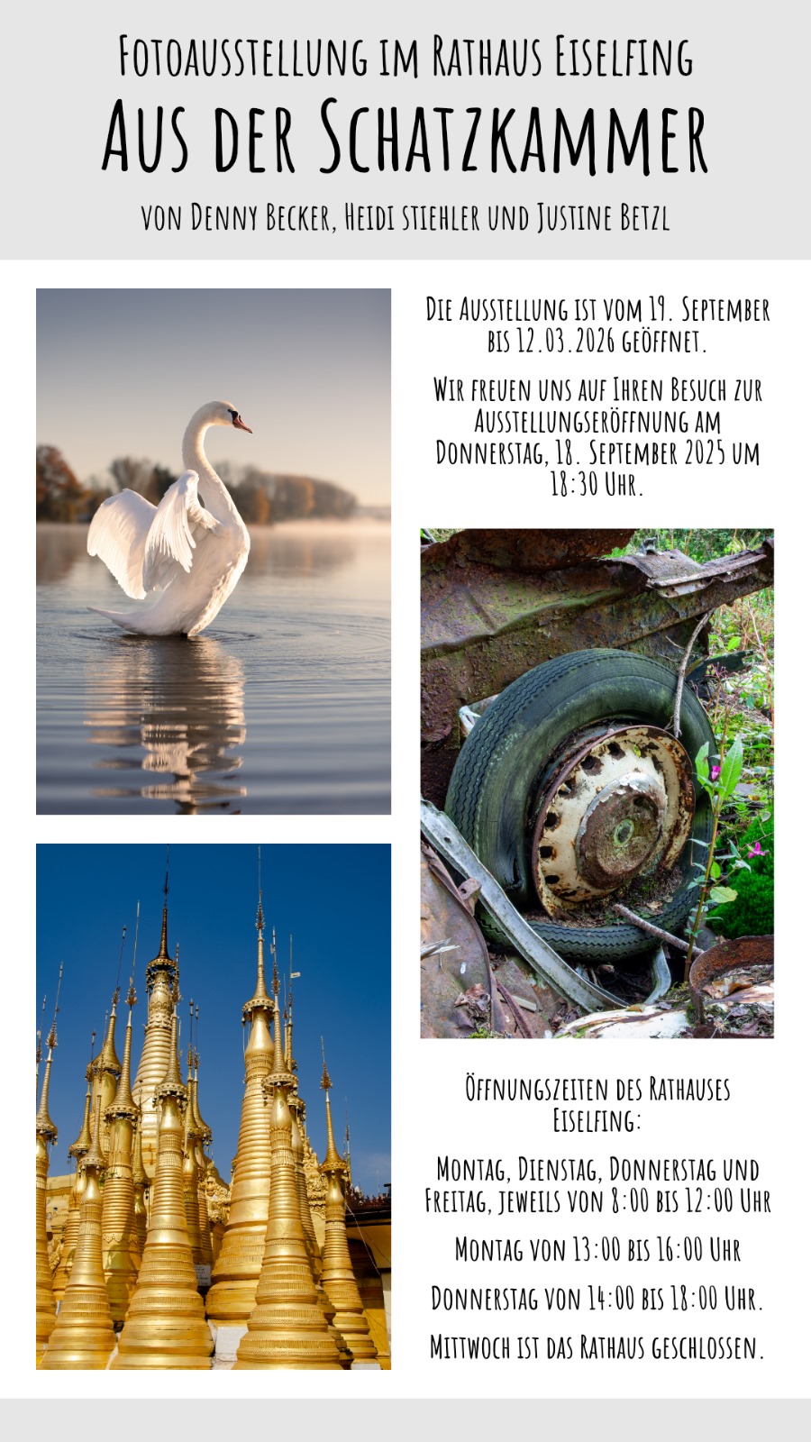 Die Mitglieder der Fotogruppe Denny Becker, Justine Betzl, Heidi Stiehler stellen vom 19.09.2025 bis 12.03.2026 Bilder aus ihrer Schatzkammern aus.